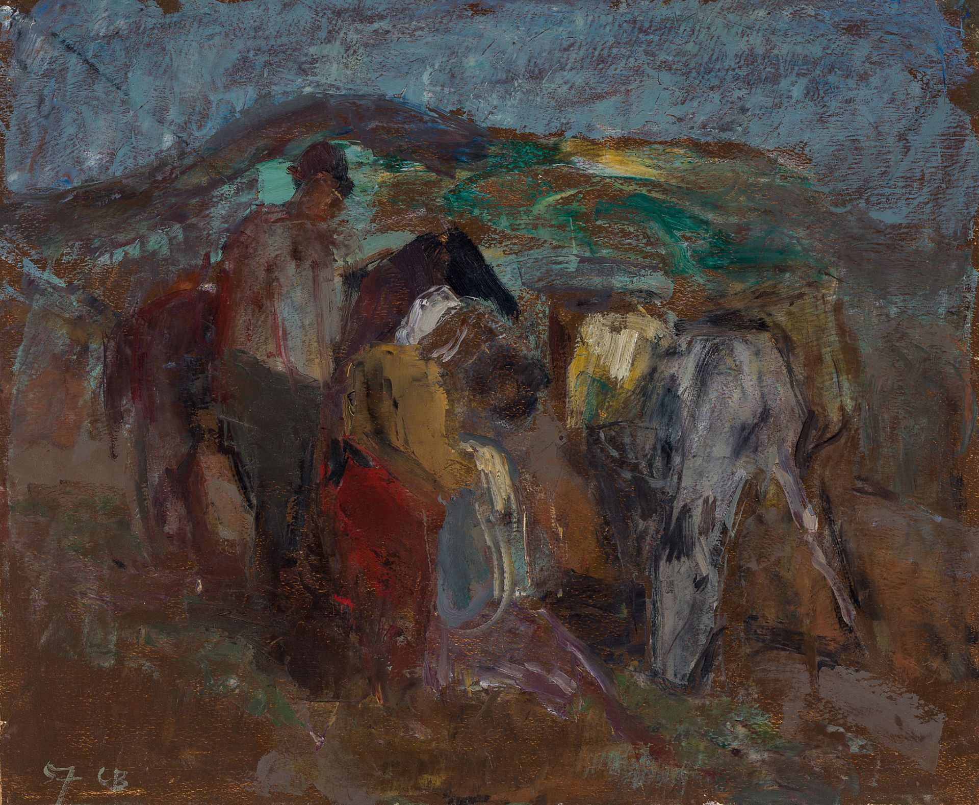 signed in monogram and dated lower left in white: 57 CB