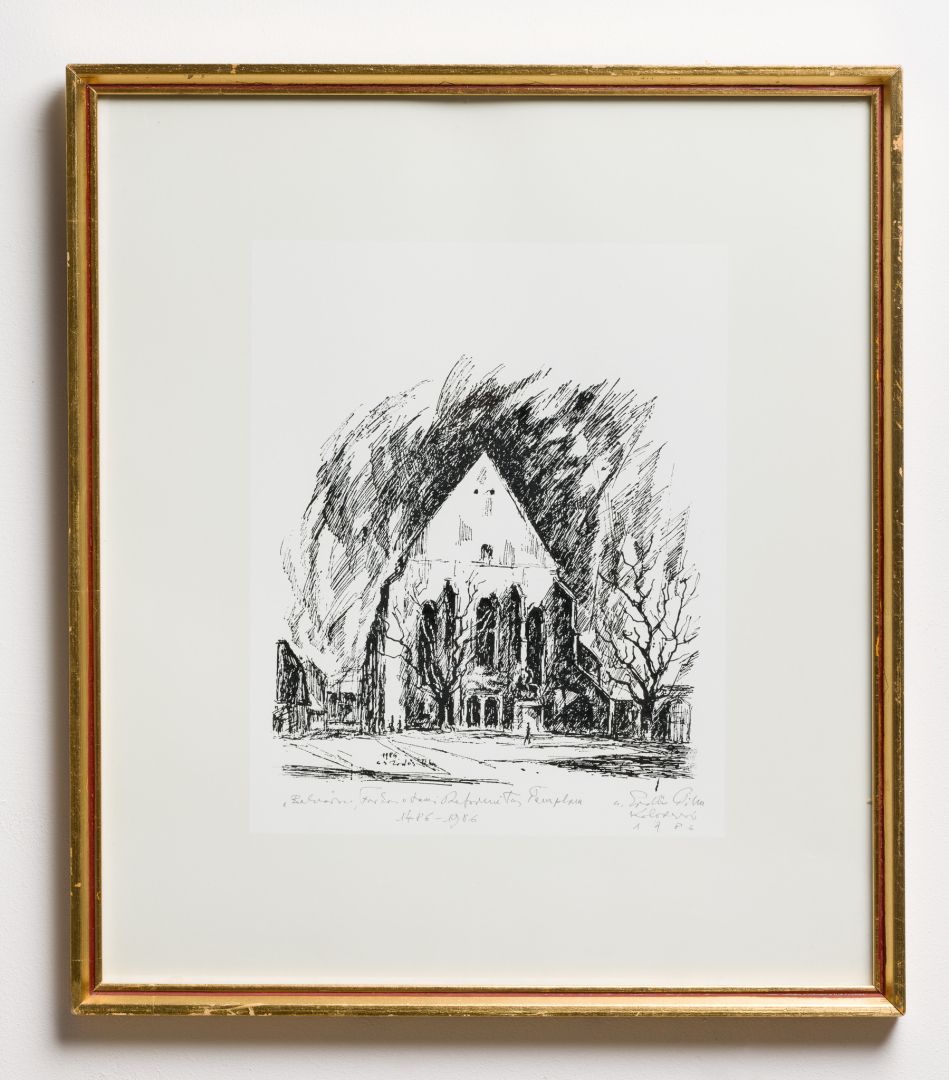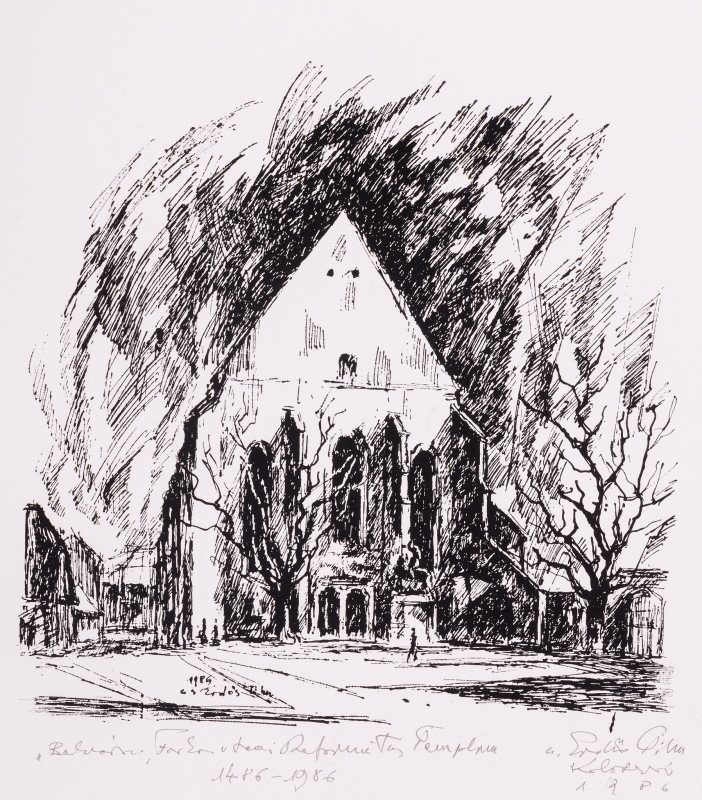 captioned lower left in pencil: „Belvárosi Farkas utcai Református Templom / 1486-1986”