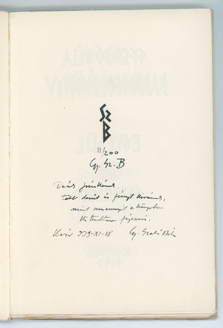 signed, located and dated by dedication: Deák Irénkének / több derűt és fényt kívánok, / mint amennyit e könyvben / ki tudtam fejezni. / Kvár 939-XI-18 Gy. Szabó Béla