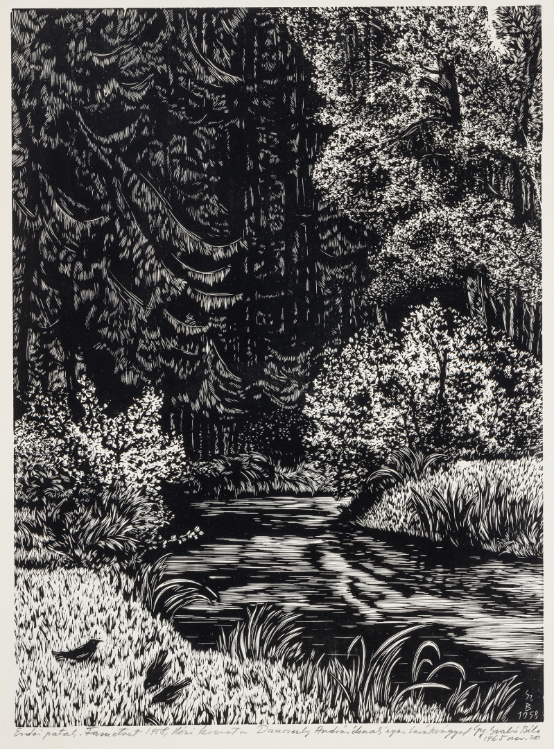 captioned and dated lower left in pencil: Erdei patak. Fametszet 1958