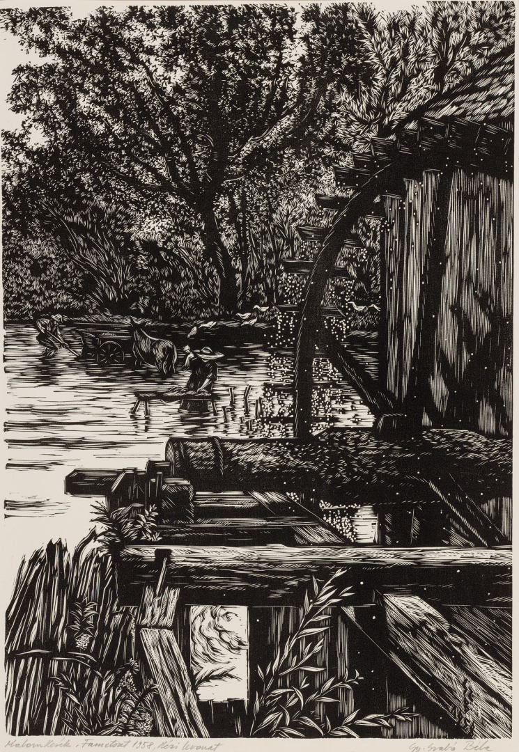 captioned and dated lower left in pencil: Malomkerék. Fametszet 1958