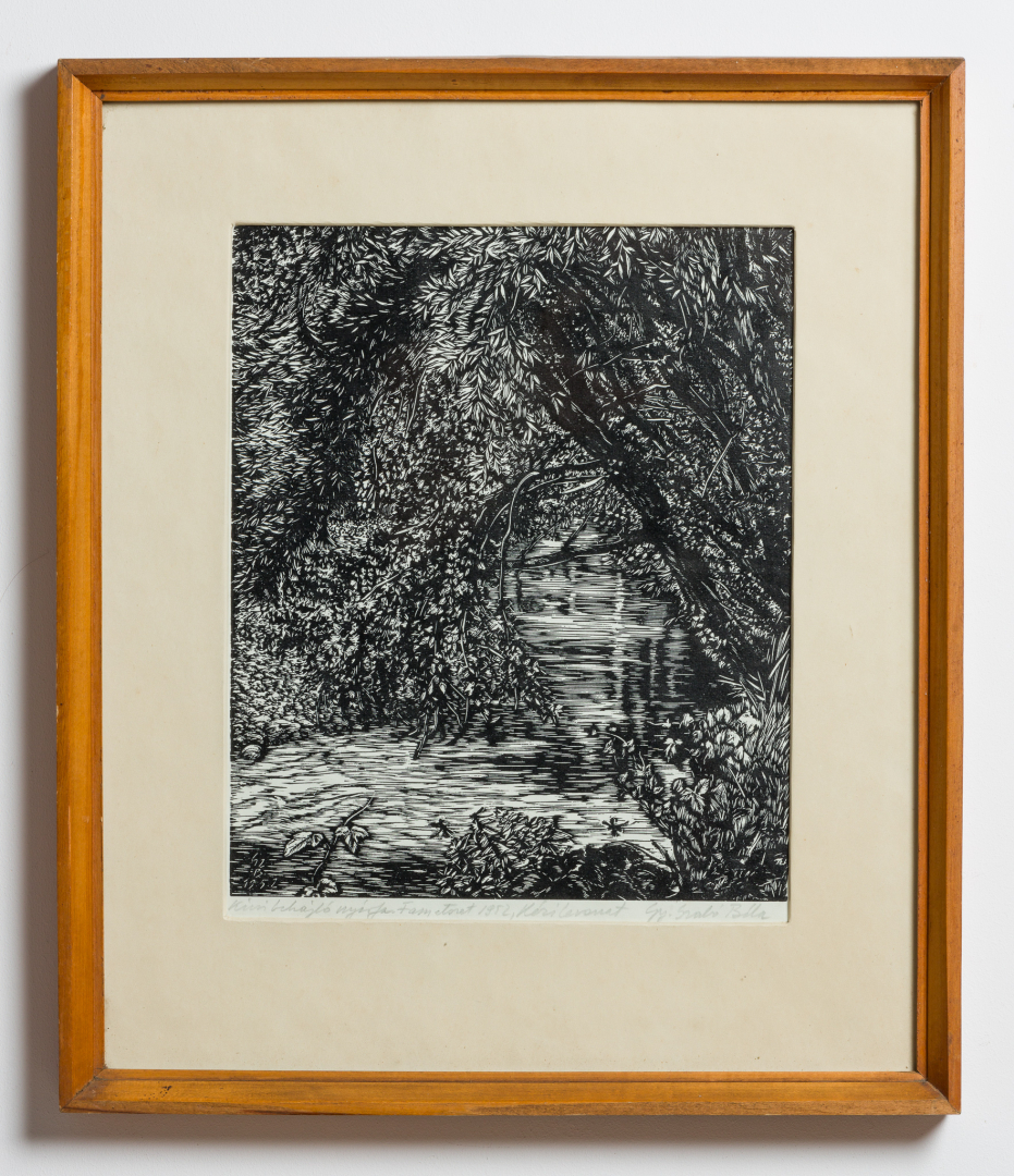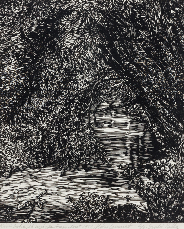 captioned and dated lower left in pencil: Kicsi behajló nyírfa. Fametszet 1952