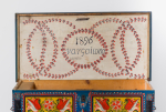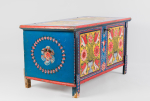 Painted wooden crate with hidden drawer, iron handles; in relatively good state of conservation.